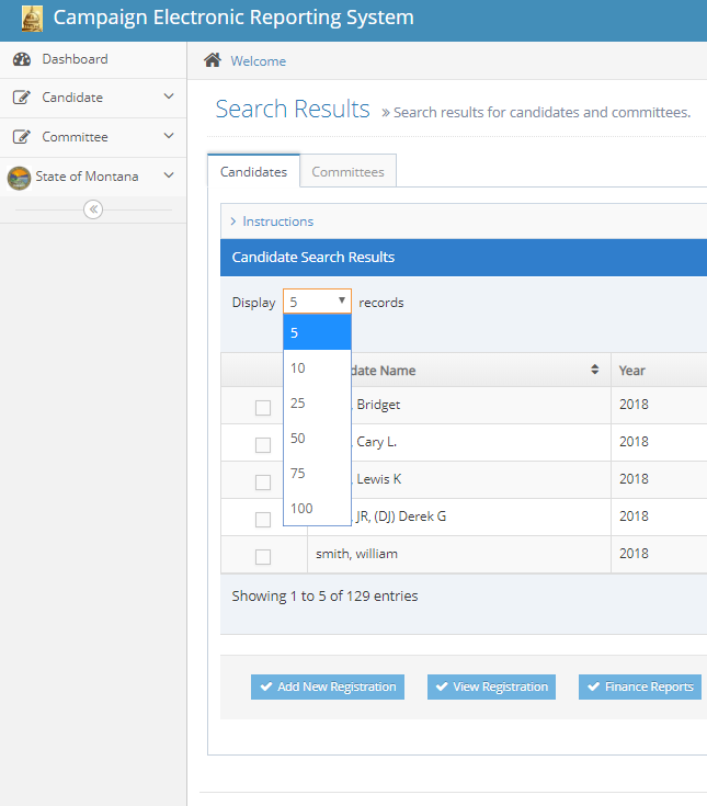 * Note that only five records appear at a time. To increase search results, select the dropdown Display tab to display up to 100 results per page (see image below).